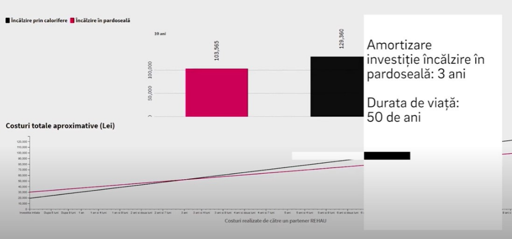 În cazul caloriferelor, investiția inițială este mai mică, dar plătești mai mult pe încălzire deoarece agentul termic trebuie încălzit la o temperatură mai ridicată. Pe de altă parte, investiția mai mare în încălzirea în pardoseală se amortizează în timp, datorită funcționării la temperaturi scăzute a agentului termic; obții economii lunare de până la 50% din factura de încălzire.