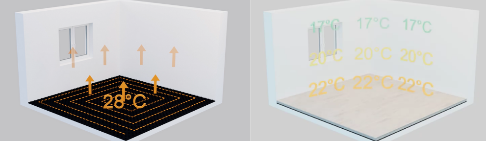 În cazul caloriferelor căldura este concentrată în proximitatea acestora, în timp ce în restul camerei și la nivelul picioarelor este o temperatură mai rece. Pe de altă parte, sistemul de încălzire în pardoseală asigură încălzirea uniformă a aerului din încăpere, care se răcește ușor de la pardoseală spre plafon și nu mai există curenții de aer provocați de calorifere.